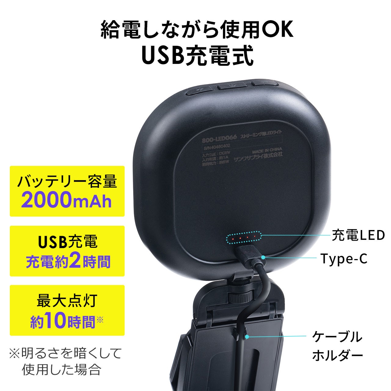 LEDライト 小型 充電式 ストリーミングライト モニター引っ掛け スタンド設置 最大240ルーメン LED20粒 色温度5段階 800-LED066 | 通販ならサンワダイレクト
