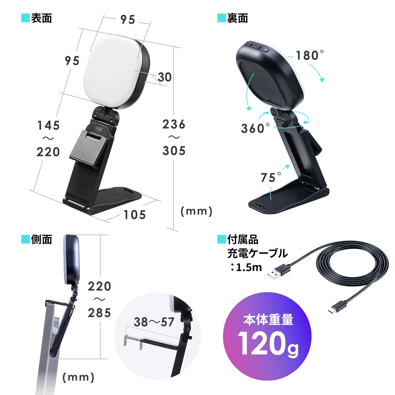 品番:800-LED066ここがポイント!・かける、置く、立てるの3WAYで使える・手元用照明や撮影用の照明にもぴったり・自撮り配信やWEB会議用のライトとして商品仕様■製品サイズ:約W95×D105×H305mm■重量:約120g■バッテリー容量:2000mAh■消費電力:約5W■コネクタ:Type-C■光束:最大約...