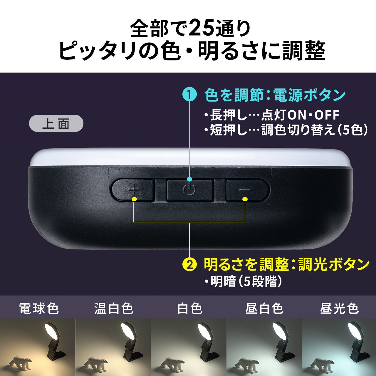LEDの色は5色展開で。明るさも5段階で調節可能です。本体カバーが光を散らしてやわらかい印象で照らすことができます。