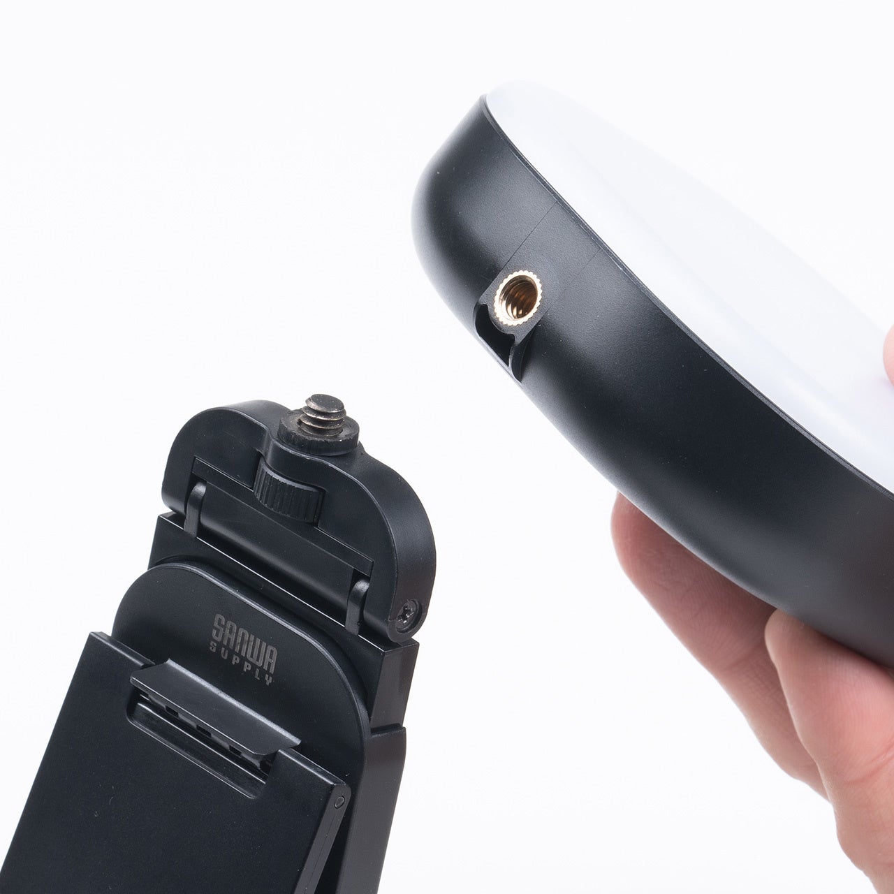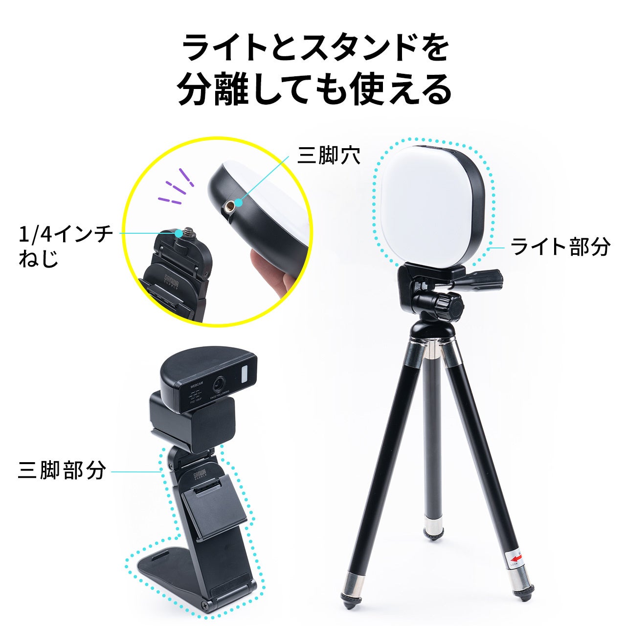 ライトとスタンドの接続部は、カメラ三脚等と同じ規格のネジタイプでそれぞれ独立させて活用することができます。