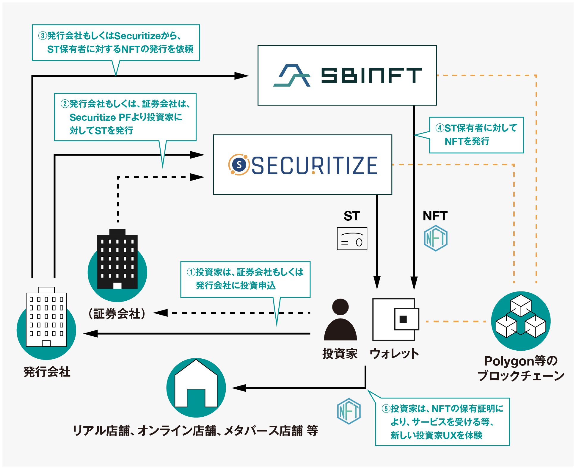 今回の提携により、SecuritizeのSTプラットフォームとSBINFTのNFTプラットフォームを連携させ、新しい投資商品「特典NFT付きST」の発行・管理が可能となるサービスを、ST発行企業に提供します。これにより、ST発行企業はこれまでの投資商品における配当・利払などの金銭的リターンだけではなく、NFTをデジタル特典として付与することによる投資家エンゲージメントが可能となります。
