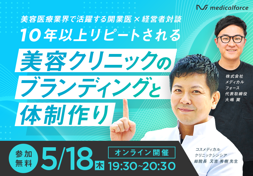 本セミナーでは、激戦区である銀座と渋谷で美容クリニックを展開されているコスメディカルクリニックシンシア総院長の又吉秀樹先生をゲストにお招きし、10年以上患者様に愛され通い続けていただくための秘訣を、ブランディングや組織構築といった観点からご紹介いたします。
