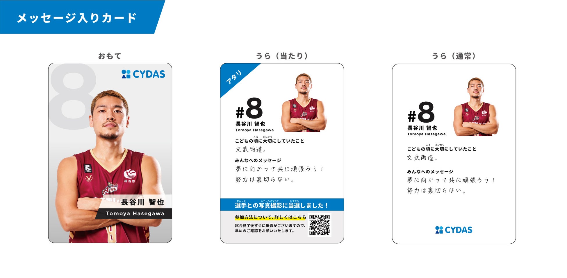 カードは、越谷アルファーズの全選手、専属チア「Alpha Venus」のメンバー、公式キャラクターのアルファマンも含めた計25種類、合計200枚を配布予定です。そのうち20枚が「当たりカード」となっており、見事当たりをゲットしたお子様は、試合終了後、選手と一緒に集合写真を撮ることができます(※)。