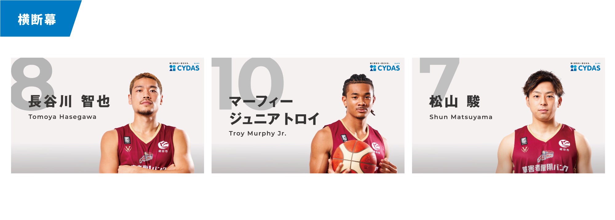 5月5日、6日に行われる試合では、会場となる越谷市立総合体育館全体を越谷アルファーズの選手一人ひとりの横断幕で埋め尽くして「見える化」。会場を見渡した時、自分の横断幕を見て、「よし、頑張ろう!」と奮い立つ原動力になりますよう、願いを込めて作成いたしました。