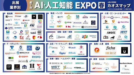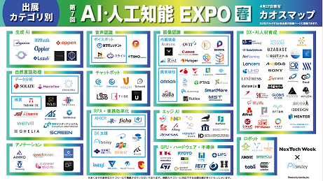 開催に際し、本展のメディアパートナーであるAIsmiley様に、第7回 AI・人工知能 EXPO【春】出展社のカオスマップを作成いただきました。