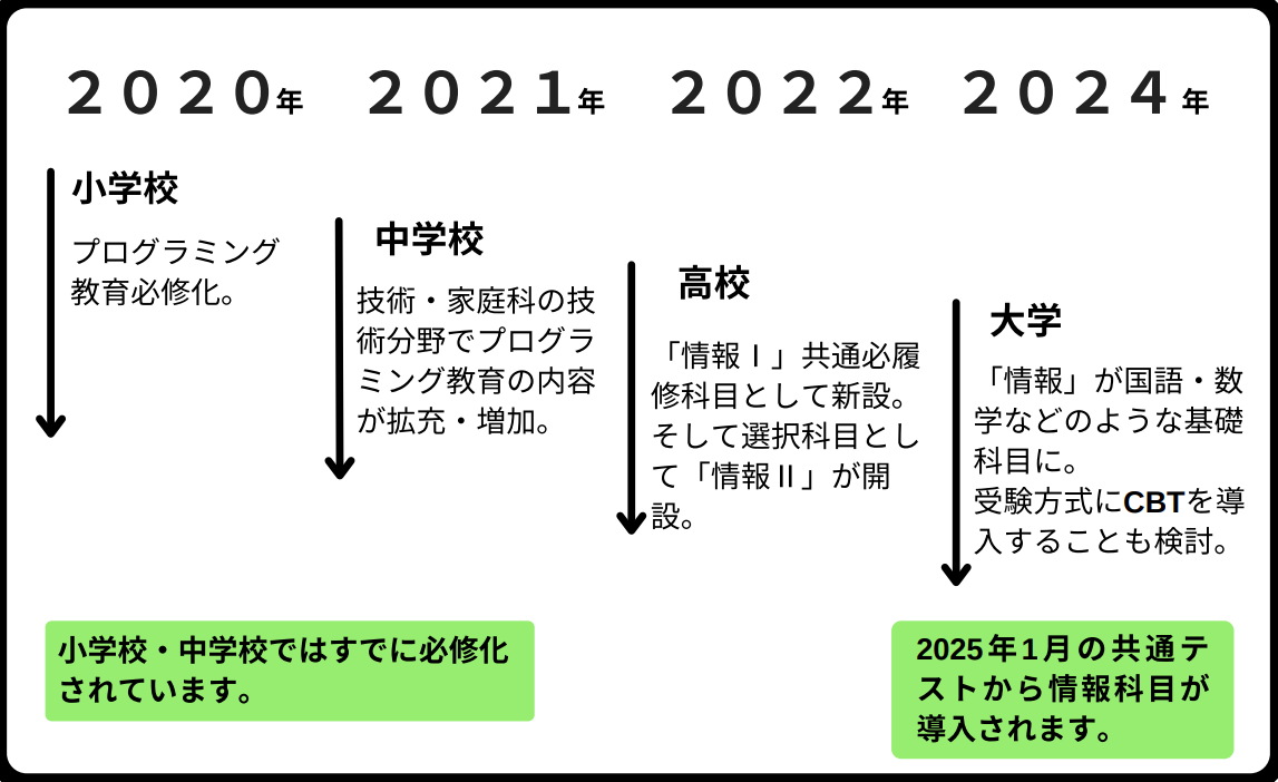 学校教育の内容を定めている新学習指導要領によれば、小学校は2020年度から、中学校では2021年度から、高校では2022年度からプログラミング教育を必修とし、大学入試科目にも2024年からプログラミングが導入されます。