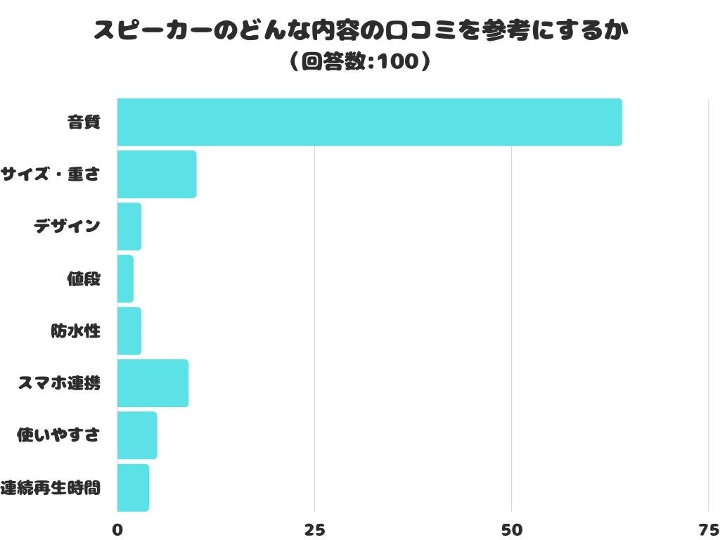 スピーカーのどんな内容の口コミを参考にするかをアンケートにて調査したところ、1位は「音質」でした。