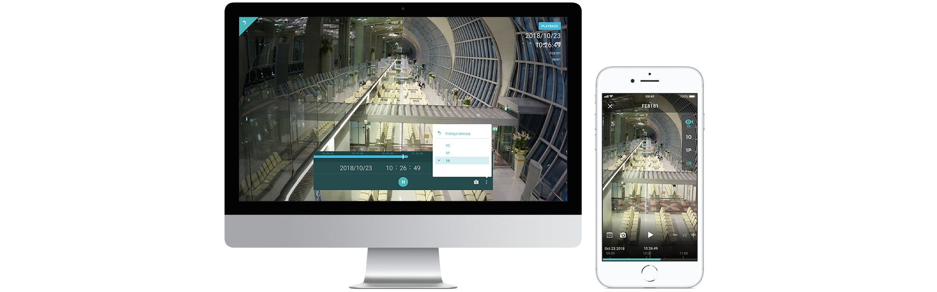 ビボテックの全方位カメラの歪み補正はモバイルアプリでも可能です。全方位カメラの1O、1P、1Rモードを選択し、ePTZを使用して異なるアングルからストリーム映像を見ることができます。