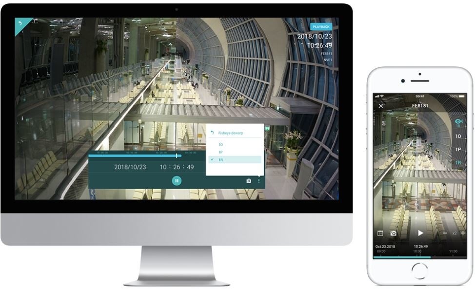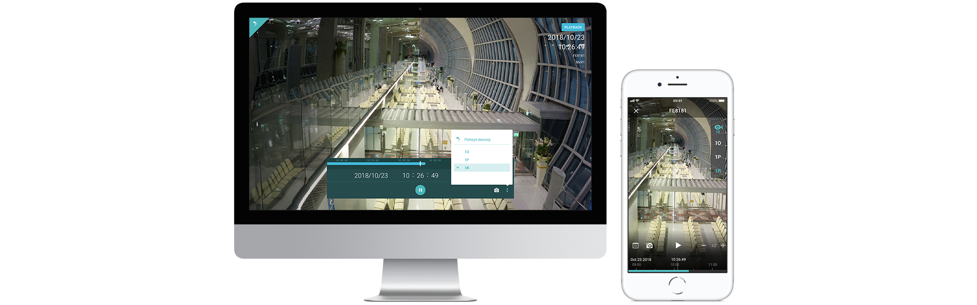 ビボテックの全方位カメラの歪み補正はモバイルアプリでも可能です。全方位カメラの1O、1P、1Rモードを選択し、ePTZを使用して異なるアングルからストリーム映像を見ることができます。