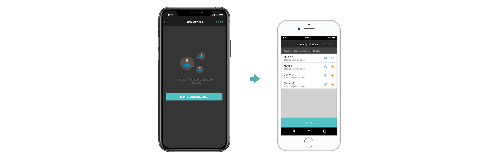 またVIVOCloudは、VIVOTEKのNDシリーズNVRやクラウドベースのIPカメラとの簡単な接続をサポートしています。シェア・デバイス機能により、わずか数ステップで、ニーズに応じてシステムを簡単に拡張することができます。