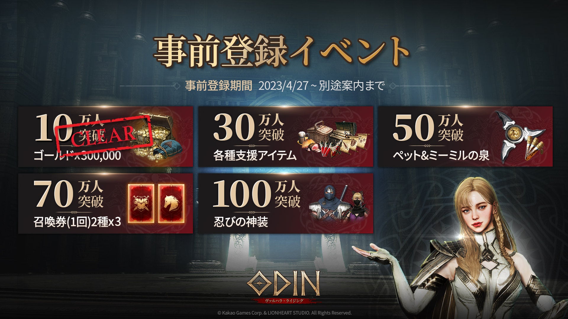 2023年4月27日(木)から事前登録を開始した『オーディン:ヴァルハラ・ライジング』は、開始から7日で事前登録者数が10万人を突破しました。これにより、登録者数達成報酬「300,000ゴールド」を正式サービス時に全ユーザー様に配布することが確定しました。事前登録キャンペーンはまだまだ実施中ですので、この機会にぜひ登録してみてください!