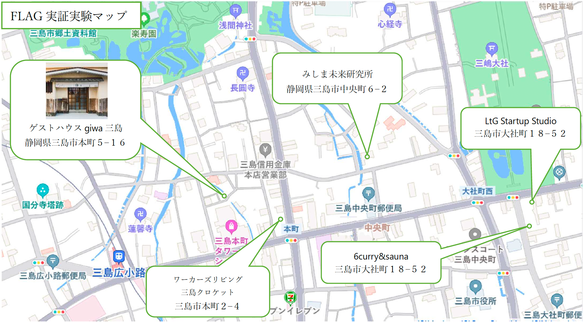 本事業ではアプリを活用し、コワーキングスペースやゲストハウス、コミュニティスペースといった三島に点在している拠点と、そこに滞在している人の情報をリアルタイムで可視化。三島の地理に明るくないビジネス客などの市外来訪者と地元人材が興味や目的をきっかけに繋がり、交流を活性化させることで街の賑わい創出を目指します。