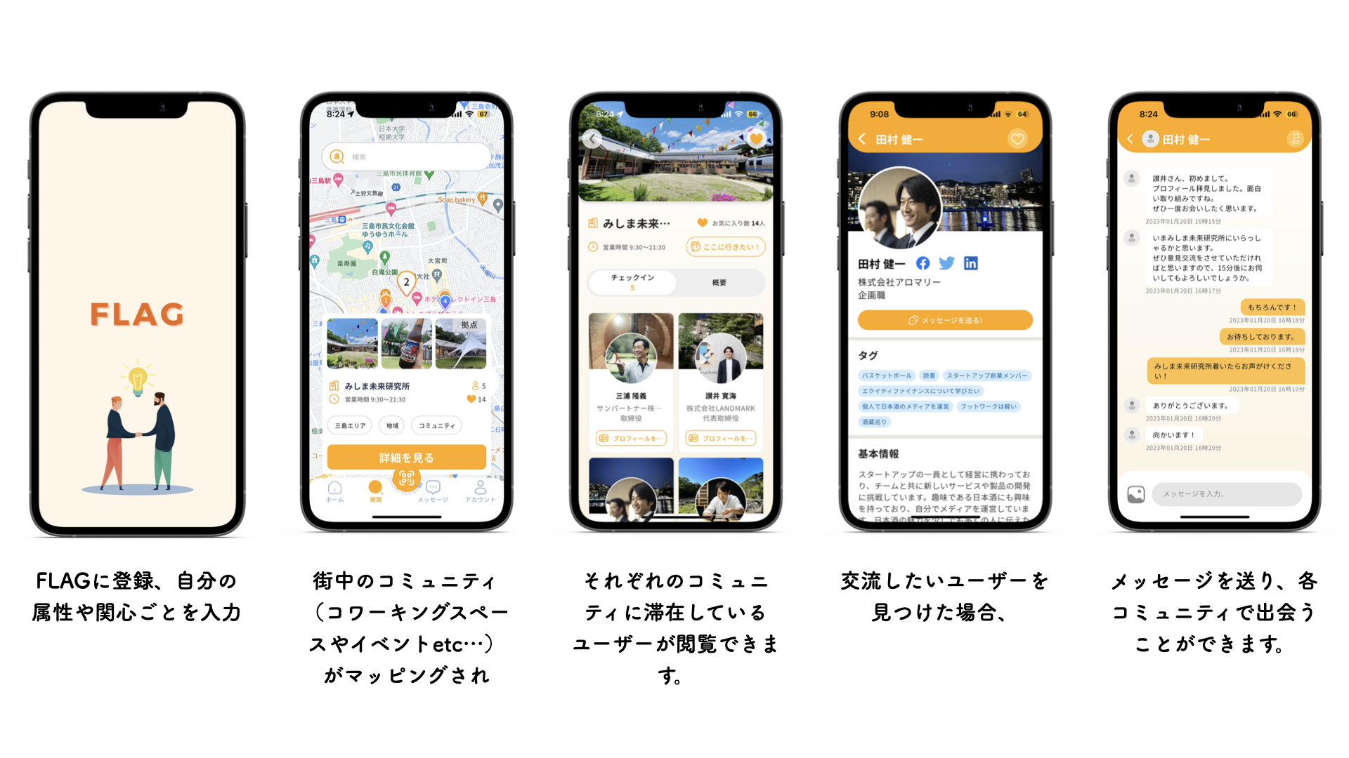 私たちが手掛けるサービス「FLAG」は、効率的に街中の人やコミュニティとの出会えるサービスです。