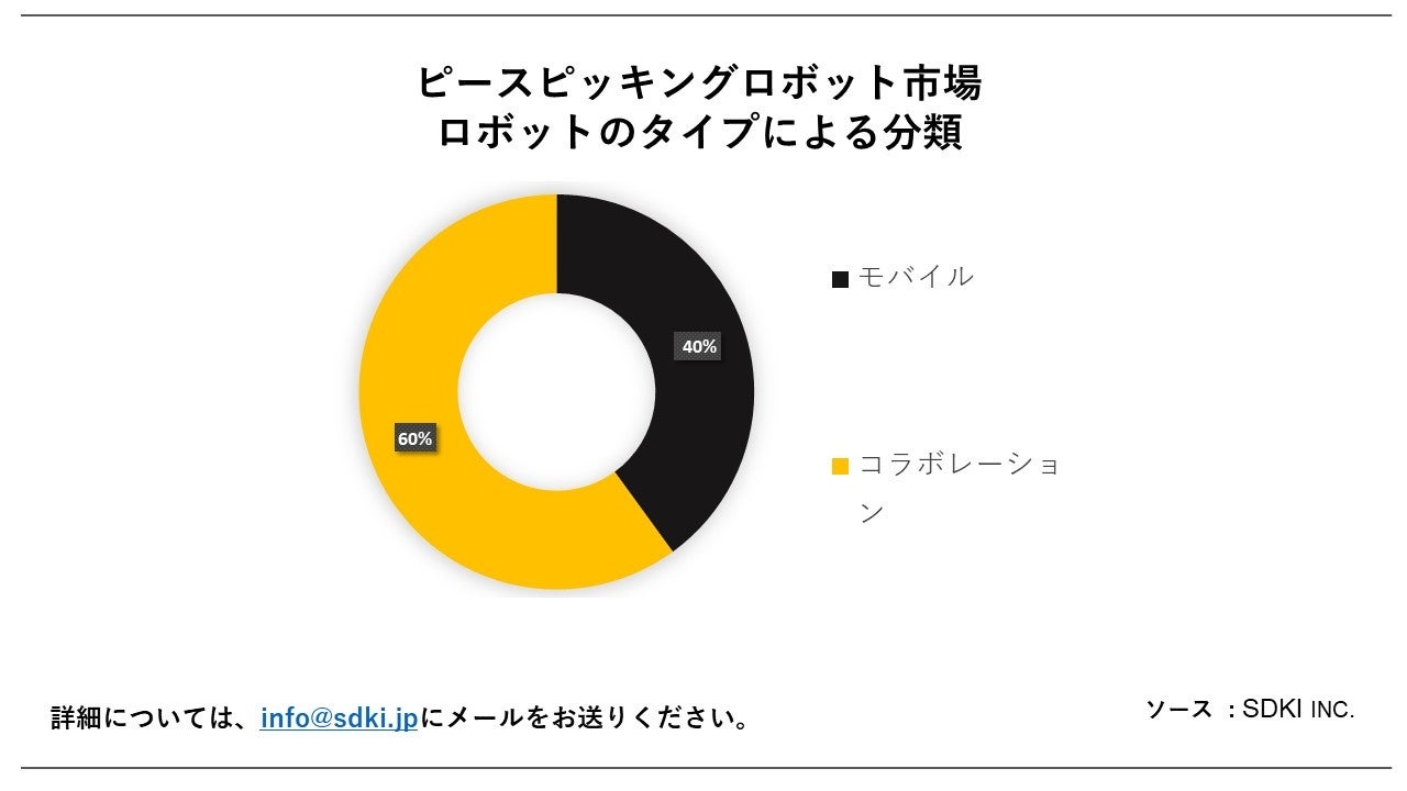 ロボットのタイプに基づいて、2035年末までに最大の市場シェアを占めると予想されるのは、コラボレーションセグメントで す。協働ロボットとは、人間の作業者と安全に協働できるロボットで、工場環境の内外でますます高度化し、有用性が高まっています。協働ロボットは、より強力になると同時に、より安価で広く利用できるようになってきています。この2つの性質が、今後の爆発的な市場成長の主な原動力となっています。協働型ピースピッキングロボットを使えば、現在のピッキング環境に自動化を導入し、施設を中断したり再配置したりすることなく、生産性を大幅に向上させるチャンスがあります。例えば、2022年5月、現代自動車は、自律走行、ロボティクス、AIなどの分野でモビリティ技術を進化させるため、2025年までに米国で50億米ドルを投資する予定です。