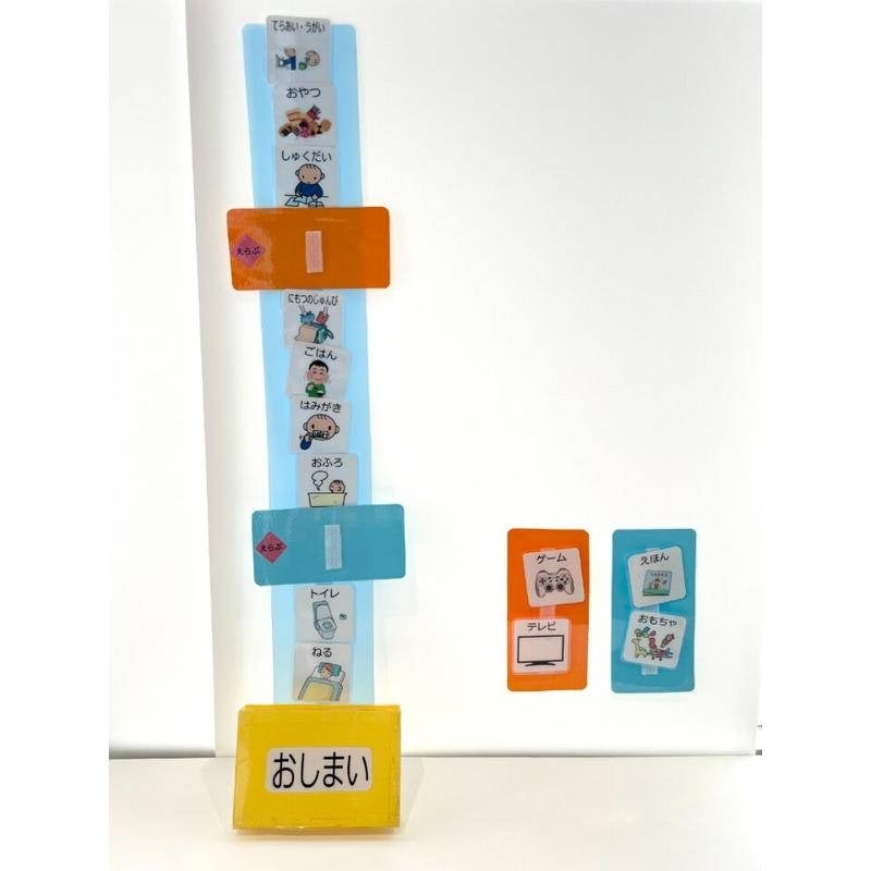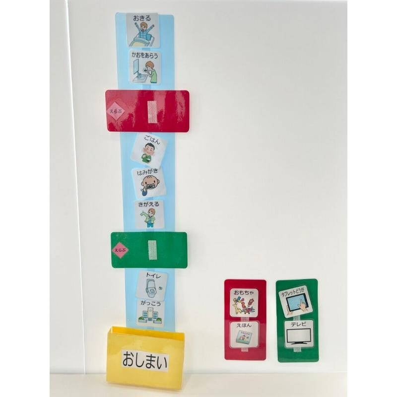 終わった活動のカードは外すようにすると、次にすべきことがいつも一番上になり理解しやすくなります。