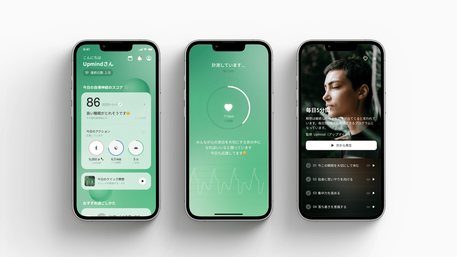 Upmindは、”誰もが心に余白をもって幸せに生きる世界の実現”を目指して、日々、事業の開発・運営を行っています。アプリ事業(25万人以上の方がこれまでに利用)では、東京大学との共同研究を開発に反映し、科学的な効果・信頼を担保するだけではなく、デザイン・ブランディング含め、スタイリッシュに取り組むことのできるサービスを実現していきます。