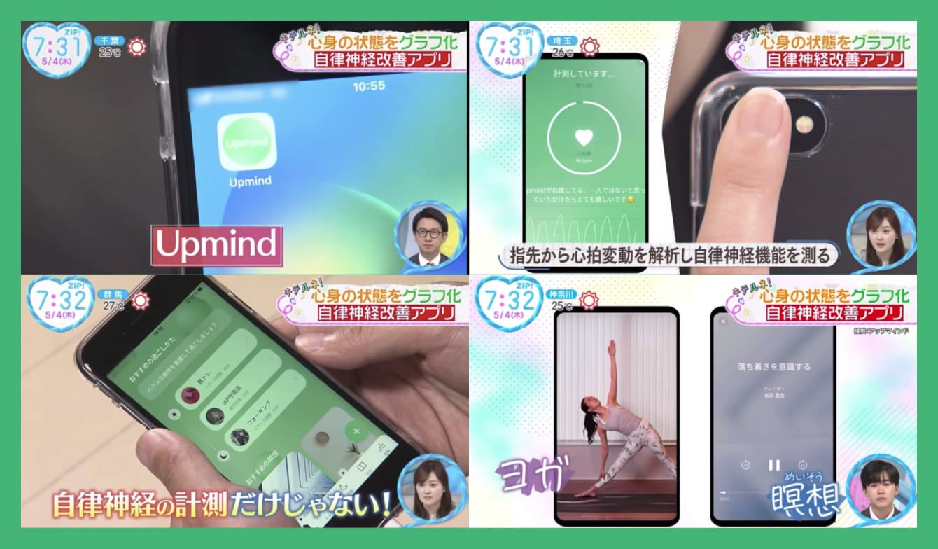 日本テレビZIP!の「キテルネ!」コーナーでヘルステックとしてUpmindをご紹介頂きました。今後も、より多くの方が身近に取り入れやすいヘルスケアの手段として浸透できるようサービス改善に取り組んでまいります。