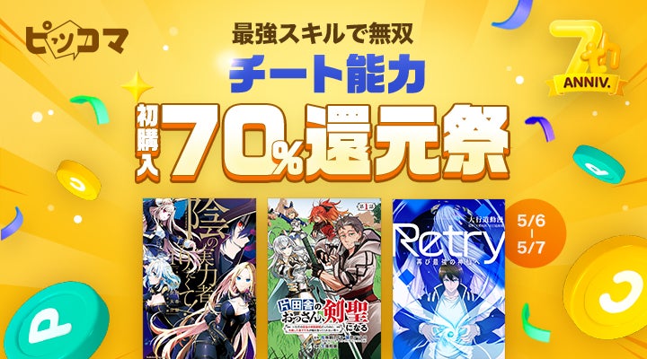 5/6(土)からは、人気テーマ毎に100作品以上が、“7周年”にちなんで70%還元される「初購入70%還元祭 」がスタートいたします。5/6(土)〜5/15 (月)の10日間、テーマに沿ってセレクトされた対象作品を初購入すると、購入額の70%相当のコイン・ポイントが還元されるお得なイベントです。