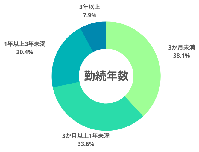 ・勤続年数が1年未満の利用者は約7割。勤続期間が3か月未満で退職する人は年々上昇傾向にある。