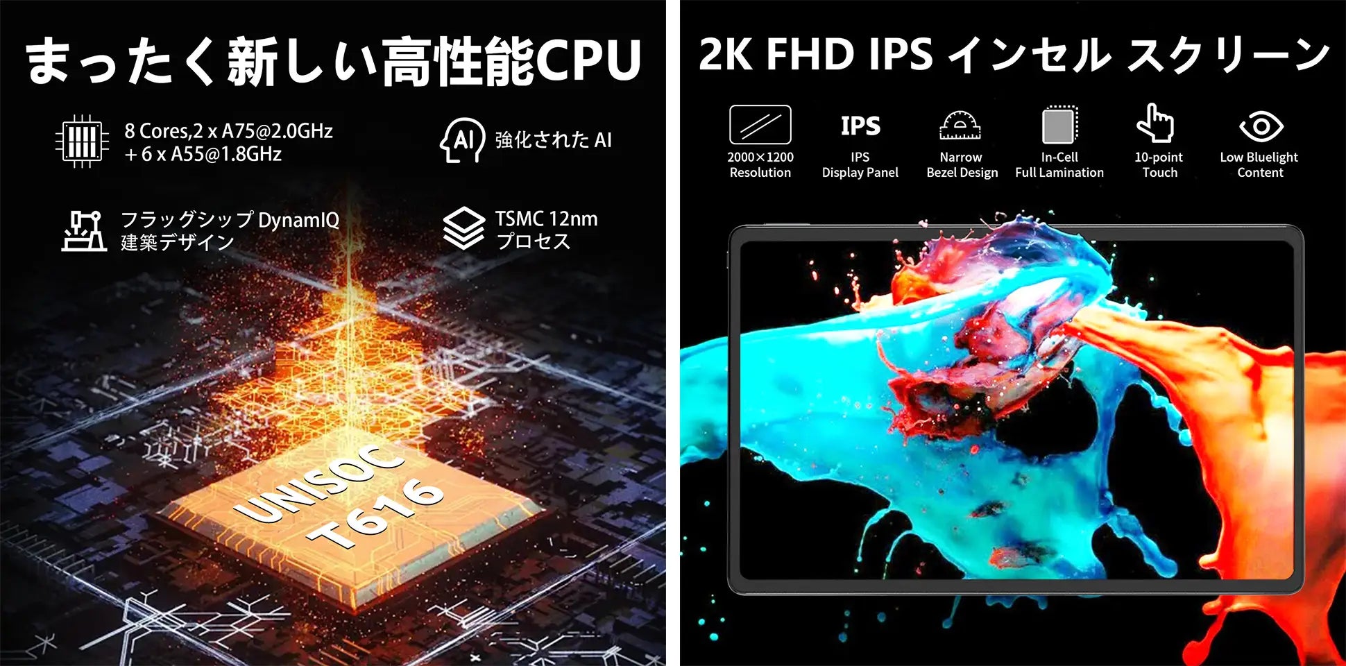 - 超高性能 8コア T616 CPU+10.4インチ 2K FHD IPS 大画面