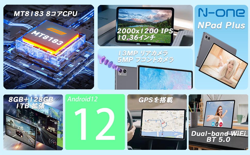 Android 12 10.4インチ タブレット wi-fiモデル、 N-one NPad Plus タブレット、MTK 8183 8コアCPU 2.0GHz、2000*1200 2K超高解像度 FHD IPSディスプレイ、8GB RAM+128GB ROM+1TB TF拡張可能+、13MP/5MPカメラ、GMS認証+Type C充電+2.4G/5G Wi-Fi対応、Bluetooth5.0+GPS