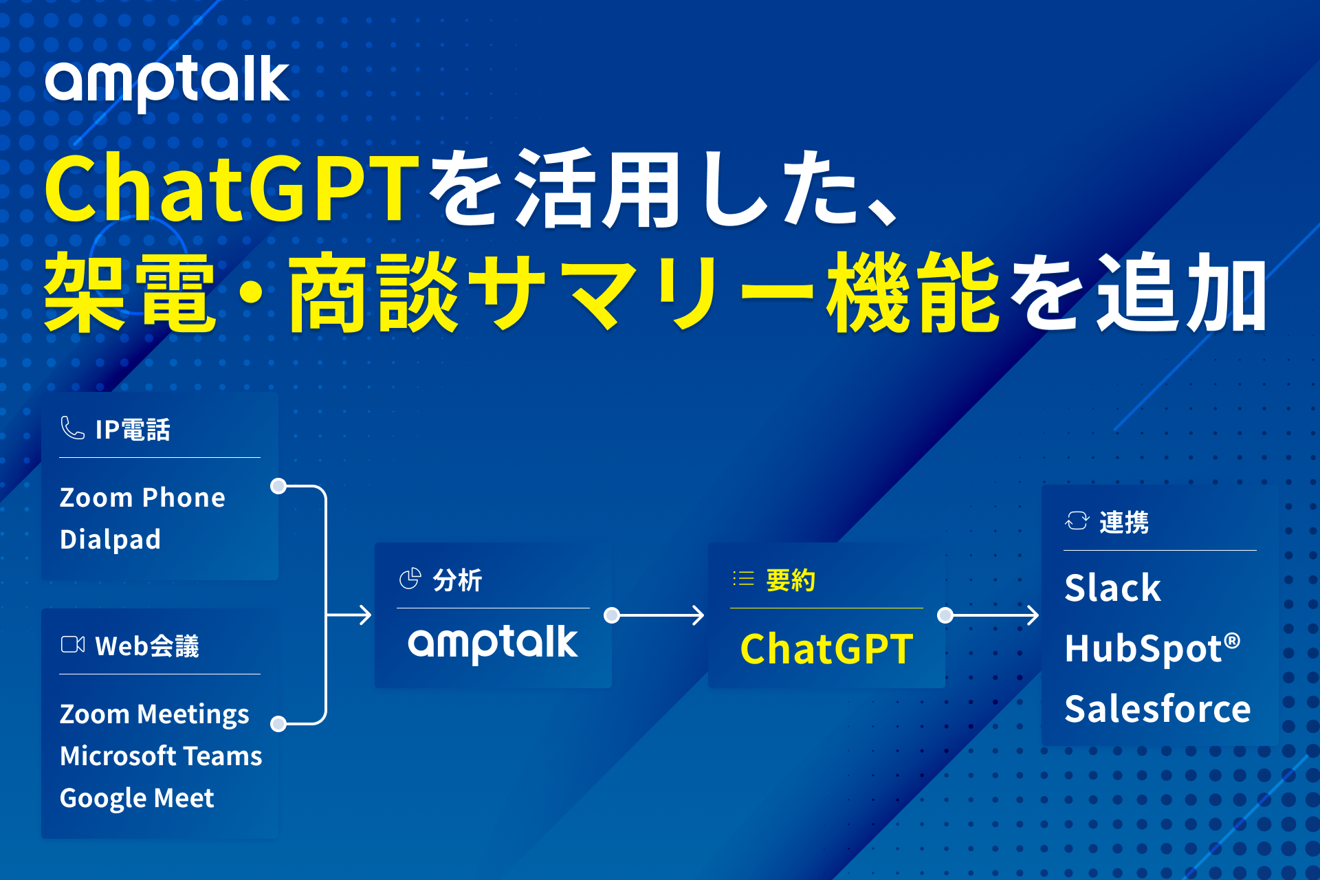 AIによる電話やオンライン商談の自動書き起こしにより、セールスイネーブルメントを実現する「アンプトーク」は、今までの自動書き起こしや分析に加え、生成AI・大規模言語モデルの分野で注目される技術であるMicrosoft社のAzure OpenAI Serviceである「ChatGPT」APIを活用し、アジェンダごとに商談相手の発言を要約する「架電・商談サマリー機能」機能を開発。要約機能が追加されることで、クライアントの要望や意見を正確に把握することが今まで以上に正確となるだけでなく、SalesforceやHubSpot、Slackでの商談の振り返り、フィードバックがより簡単に可能となります。