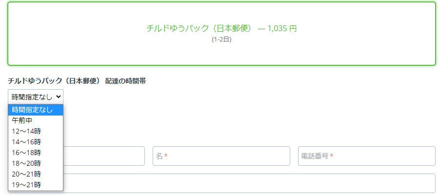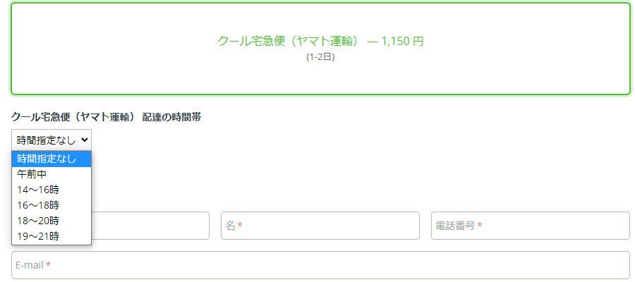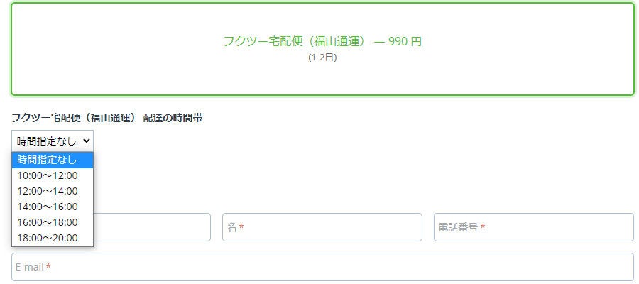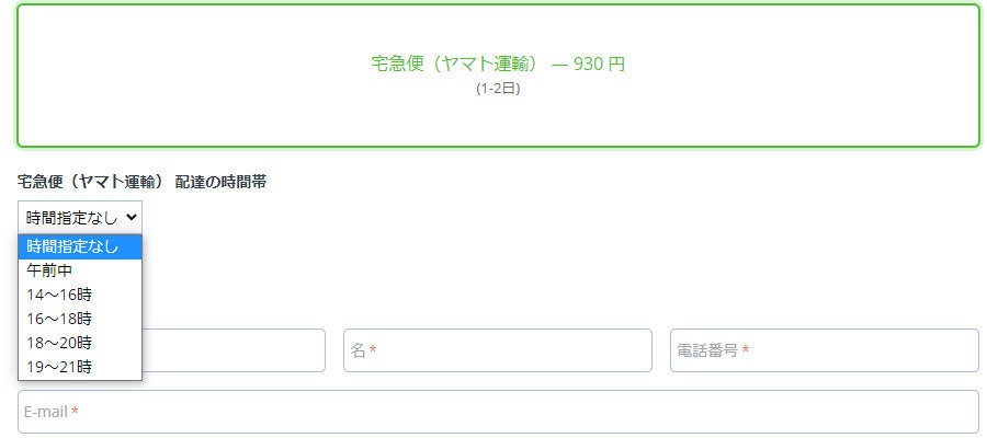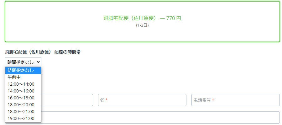 「日本国内向け配送料金自動算出」アドオンのアップデートにより、ユーザーが配送方法を選択すると、注文画面において、配送時に配達時間帯の指定ができるようになりました。