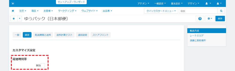 管理画面の「配送方法/税金 > 配送方法」から選択した配送方法にある「設定」の「カスタマイズ設定」で、「配送時間帯」を無効にすると配送時間帯を非表示にできます。