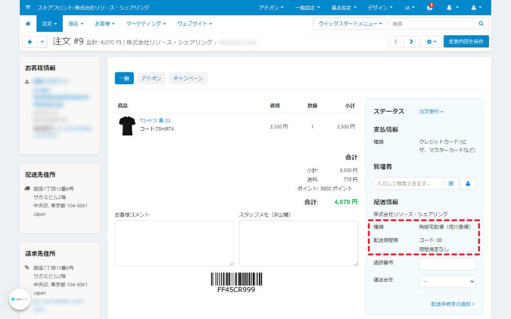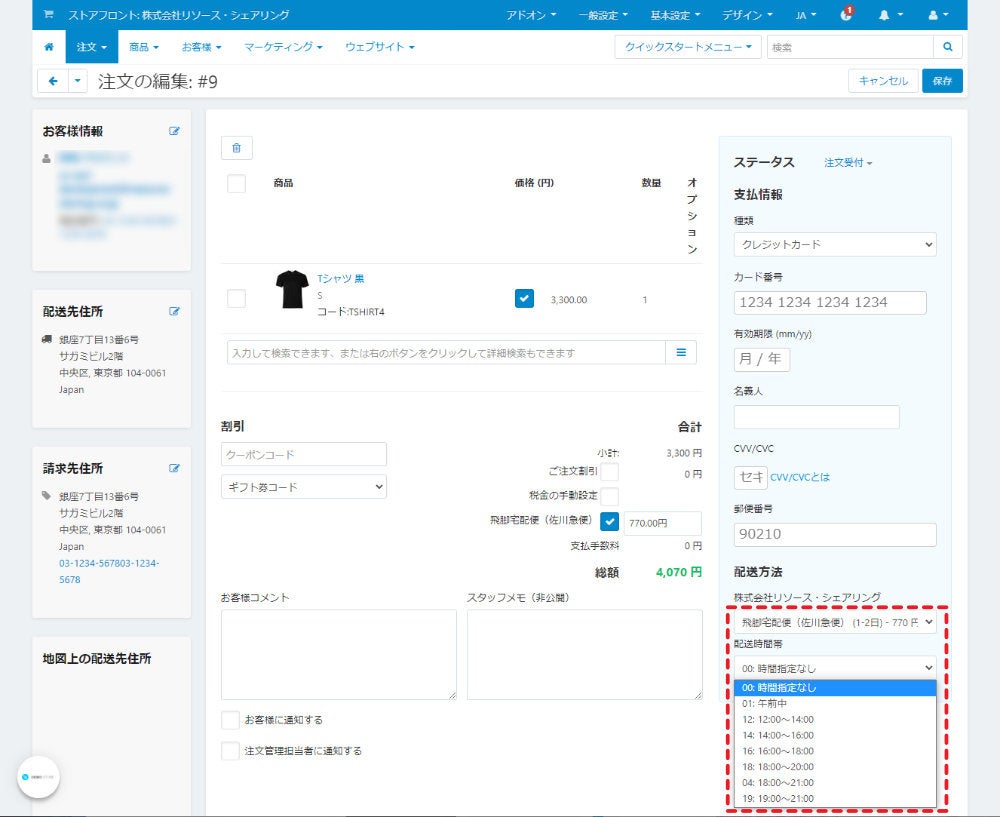 注文手続きで設定された配送時間帯は、管理画面の注文情報に表示が行われます。