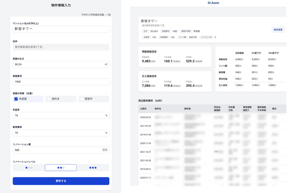 今回リリースした「リノベ再販AI査定サービス」は、仕入れ値が適正かどうか、そしてどの程度のリフォームをすればいくらで売れるのか、利益はいくら出るのかを、一気通貫で見通すことが出来るサービスとなります。適切な仕入れ目安をAIが5秒で査定し、さらに、周辺販売事例も確認することができます。もちろん勘や経験も大事ですが、それだけに頼らずAIの導入を行うことによって業務効率化やコスト削減も実現できます。