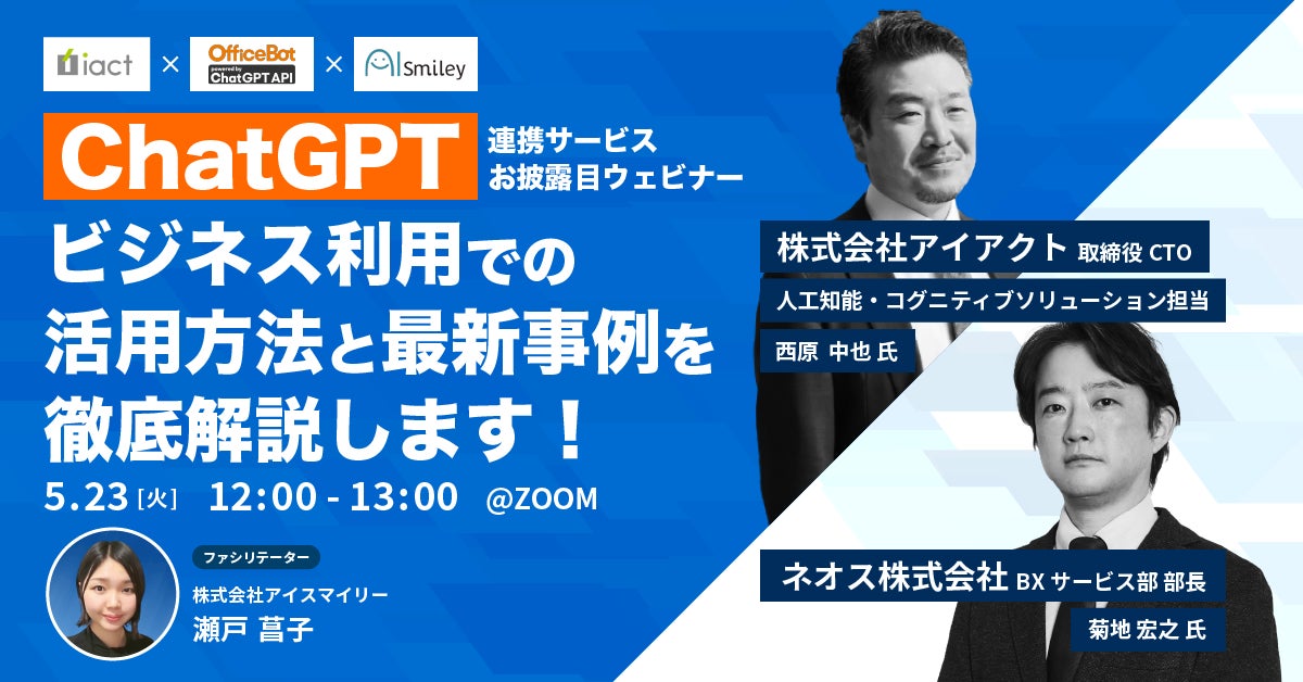 ChatGPTは、最新の自然言語処理技術を応用した非常に優れたAIモデルであり、ビジネスシーンでも活用されています。今回のウェビナーでは最先端企業2社より、ChatGPT連携サービスのビジネス利用での活用方法と最新事例についてご紹介します。検索システムやチャットボットにご興味のある方は、ぜひご参加ください。