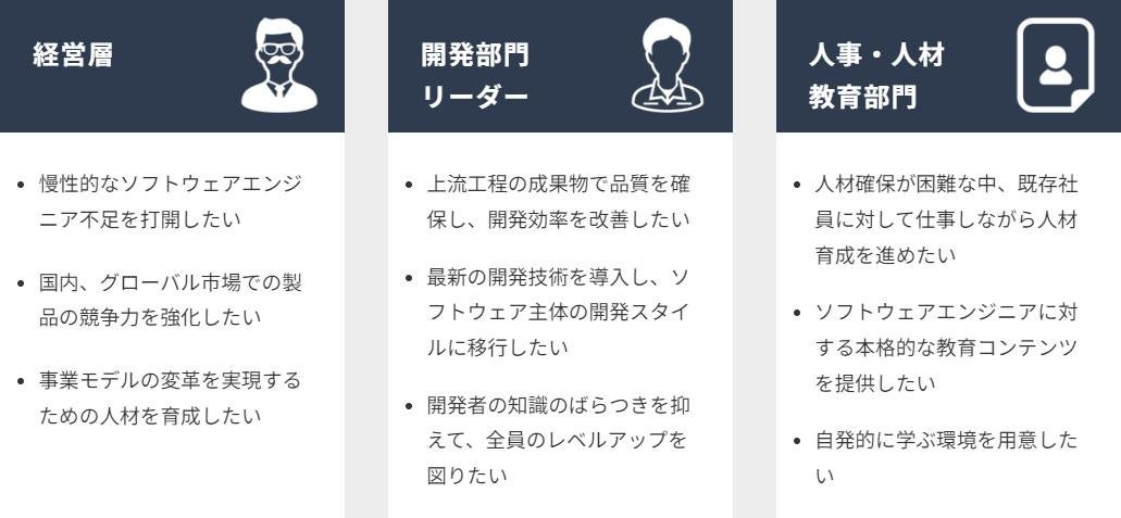 USDM、XDDP、MBDモデルベース開発ほか各種ソリューションのご提案と、現場支援、トレーニング・セミナーなどの人材育成までトータルコンサルティングいたします。組込みシステム開発の上流である要求開発から下流のテスト駆動開発までを幅広く支援し、開発現場を改革に導きます。