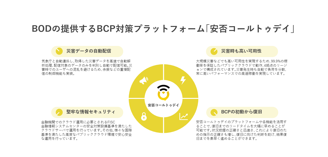 「安否コールトゥデイ」は、地震、津波、その他災害発生時などの際の従業員の安否確認をはじめ、企業のBCPの初動から復旧までを支援するBCP対策プラットフォームです。災害時での安否確認ツールとして利用の他、掲示板やアンケートの配信機能なども搭載、日常からコミュニケーションツールとしてご利用頂くことで、有事の際スムーズに活用できるよう訓練することも可能です。
