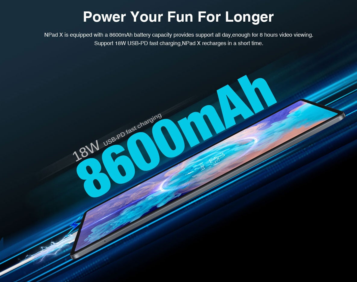 【より長時間の楽しみを提供するためにパワーアップ】NPad Xには8600mAhのバッテリー容量が搭載され、一日中の使用をサポートし、8時間のビデオ視聴に十分な電力を提供します。18WのUSB-PD高速充電に対応しており、NPad Xは短時間で充電できます。