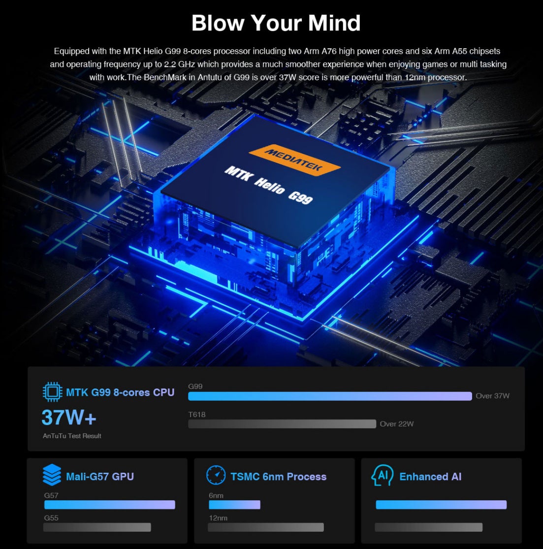 【パフォーマンス:ブロウユアマインド】MTK Helio G99 8コアプロセッサーを搭載しており、2つの高パワーコアであるArm A76と6つのArm A55チップセットを含み、動作周波数は最大2.2 GHzまでで、ゲームを楽しんだり、マルチタスキングで作業をする際には、よりスムーズな体験を提供します。G99のAntutuのベンチマークは37W以上のスコアであり、12nmプロセッサーよりもより強力です。