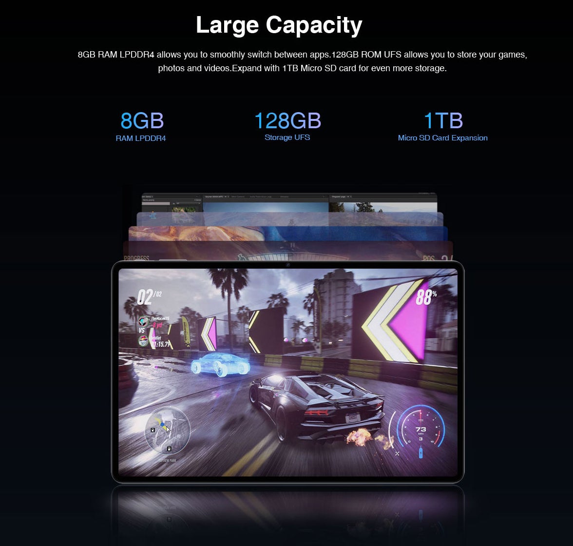 8GB RAM LPDDR4を搭載しており、アプリのスムーズな切り替えが可能です。128GB ROM UFSを搭載し、ゲーム、写真、ビデオを保存できます。さらに1TBのMicro SDカードでストレージをさらに拡張できます。
