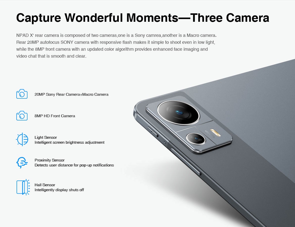 【素晴らしい瞬間を捉える- 3つのカメラ】NPAD X の リアカメラは2つのカメラで構成されており、1つはソニーカメラ、もう1つはHDカメラです。反応性の高いフラッシュを備えたリアの20MPオートフォーカスSONYカメラは、暗い場所でも簡単に撮影できます。更新されたカラーアルゴリズムを備えた8MPのフロントカメラは、滑らかでクリアな顔の映像やビデオチャットを提供します。