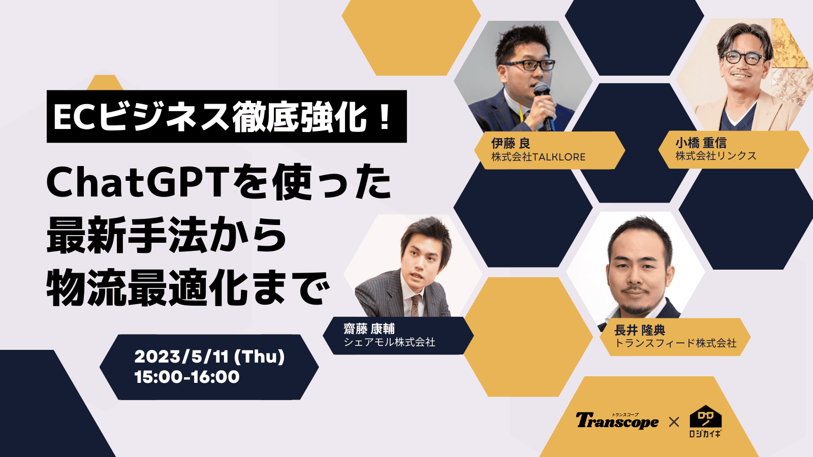 トランスコープを企画・運営するシェアモル株式会社が主催する、ECビジネス徹底強化!ChatGPTを使った最新手法から物流最適化までウェビナーの概要ページです。
