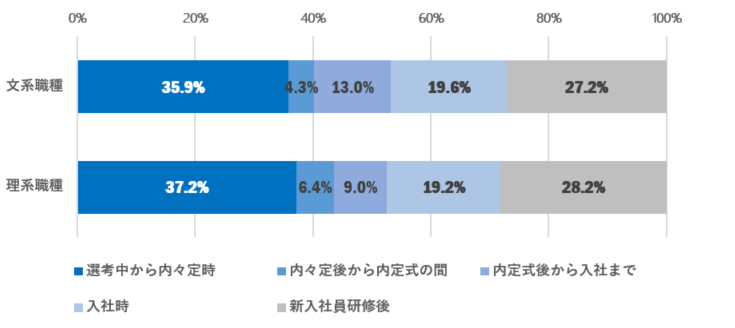 上記にて、「職種別採用」ではない対象者の配属職種をいつ決定するか確認したところ、「選考中から内々定時」が最も多かった(文系職種 35.9%、理系職種 37.2%)。これに、「内々定後から内定式の間」「内定式後から入社まで」を加えると、半数以上の企業が、文系職種・理系職種を問わず“入社前”に配属職種を決定することがわかる。