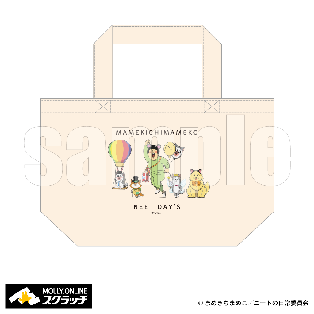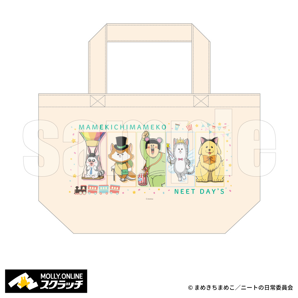 まめきちまめこ、こまち、タビ、シンバ、メロのイラストを使用したランチトートバッグ。