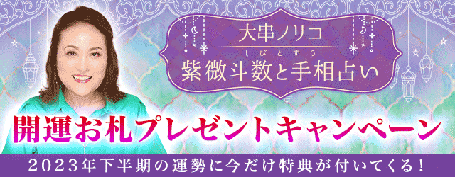 現在、2023年下半期の運勢を占うメニューに、サイト特製の開運お札が付いてくる、『大串ノリコ紫微斗数と手相占い 開運お札プレゼントキャンペーン』を開催中です。ぜひこの機会にお試しください。