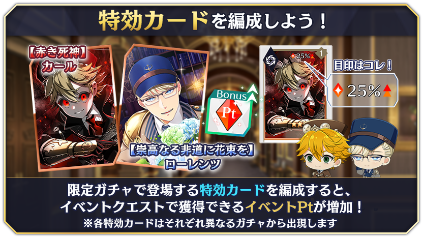 ※★3「【赤き死神】カール」は2022/6/30より開催のピックアップガチャから、★3「【崇高なる非道に花束を】ローレンツ」は2022/7/6より開催のピックアップガチャから出現します。本イベントの報酬では獲得できませんので、あらかじめご了承ください。