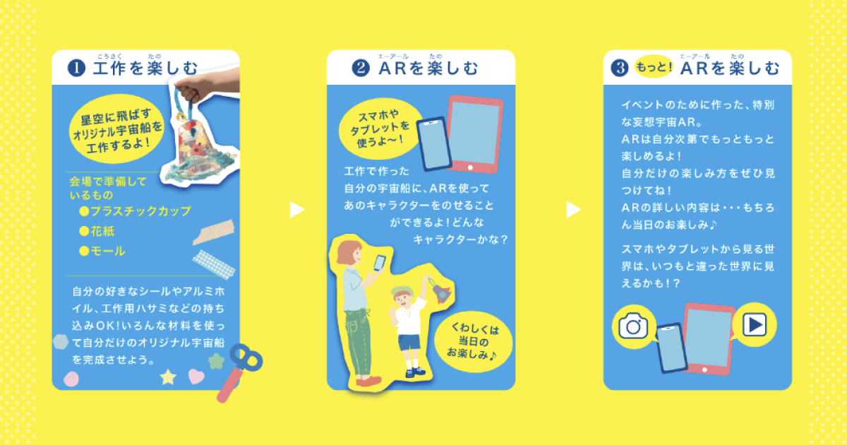 参加者それぞれがプラスチックカップを使って宇宙船を作ります。花紙やモールなど好きな材料を使ってデコレーションし、自分だけの宇宙船を完成させます。材料の一つにはARマーカーもあり、自分の作った宇宙船にARでキャラクターを乗せることもできます。また、今回イベントのために用意したAR「妄想宇宙」を参加者のスマートフォンやタブレットを通して出現させます。自分の作った宇宙船や会場の風景と一緒に写真・動画撮影し、自由に遊んでARの世界を楽しみます。