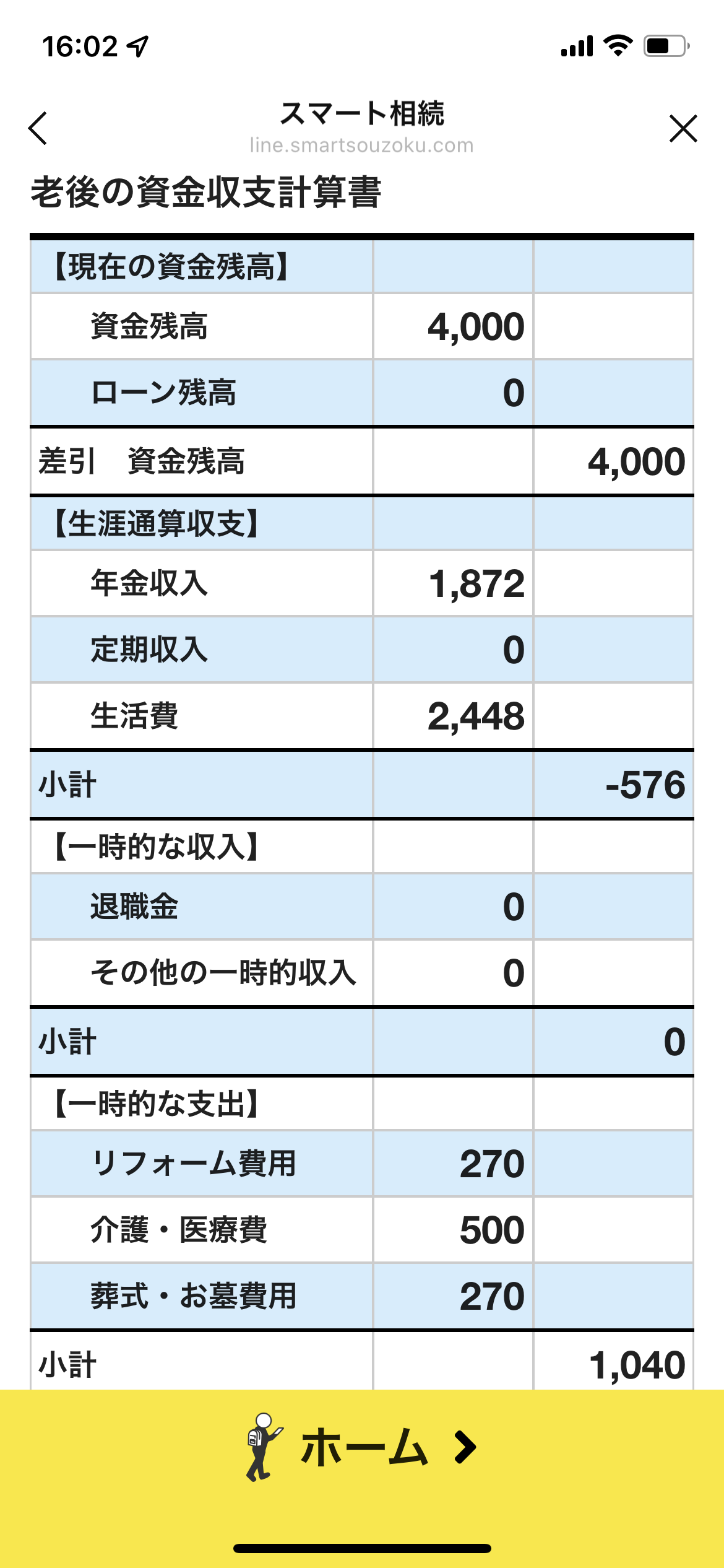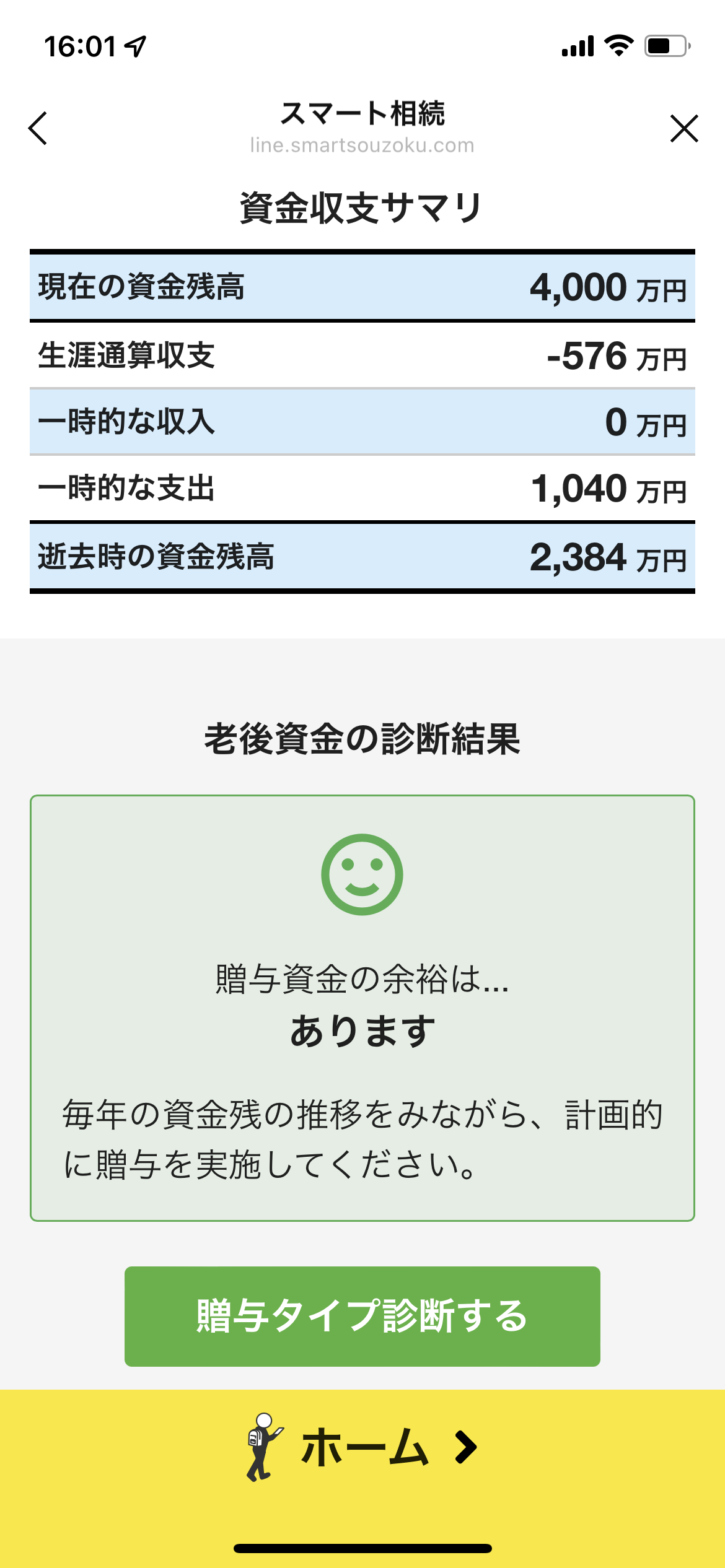 実際に贈与を考えた時、ご自身の老後資金が心配になる方も多いと思います。LINEの質問に回答する形式で老後の資金を計算し、贈与資金に余裕があるか否か判断できます。年金生活の方だけでなく働き盛りの方でも利用可能です。