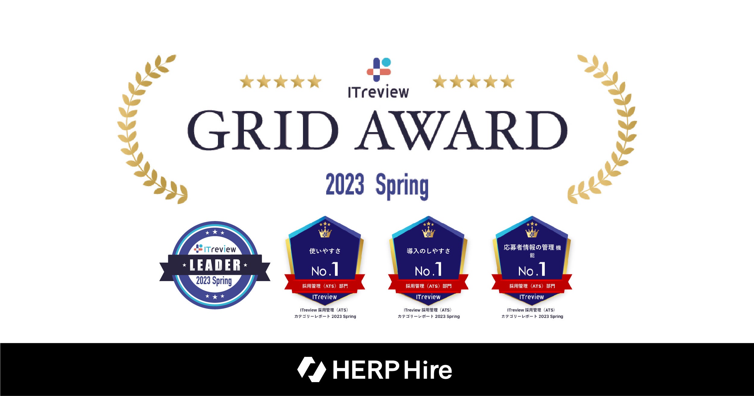 この度『HERP Hire』は「ITreview Grid Award 2023 Spring」の採用管理(ATS)部門において「Leader」を受賞しました。また、「ITreviewカテゴリーレポート2023 Spring」の同部門では「使いやすさ」「導入のしやすさ」「応募者情報の管理機能」でNo.1を獲得しています。