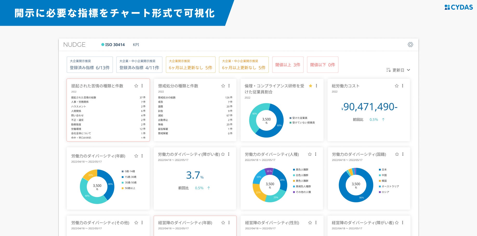 そうした要望を受け、ISO 30414の11領域を網羅した人的資本経営プラットフォーム「CYDAS NUDGE」を開発。システムに従うだけで、誰もが迷わずデータ登録でき、報告書の作成も簡単に行えるよう設計いたしました。また、パーソルイノベーション社との業務提携により、開示のためのデータ収集など一気通貫の人的資本支援サービスの提供を実現しました。