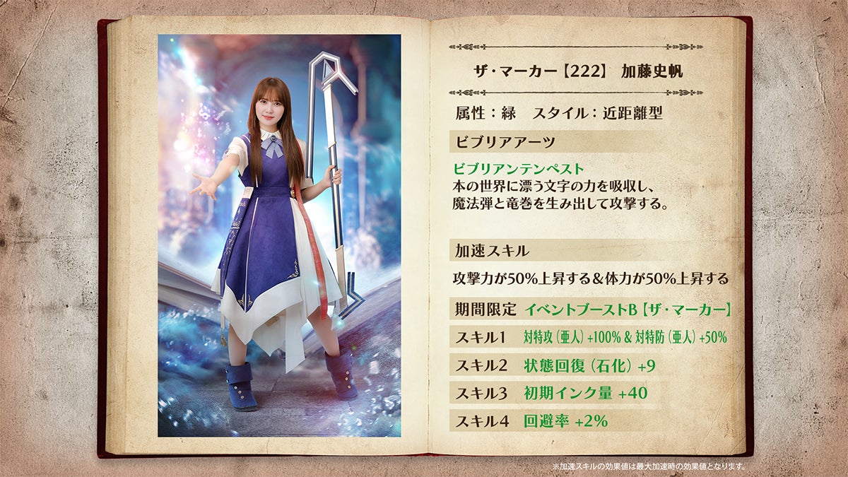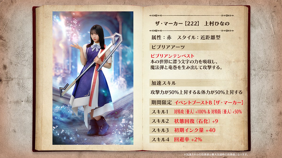 パーティ内の「★4 ザ・マーカー【222】 小坂菜緒」を超強化する効果持ち!イベントアイテム交換所から入手することができます。