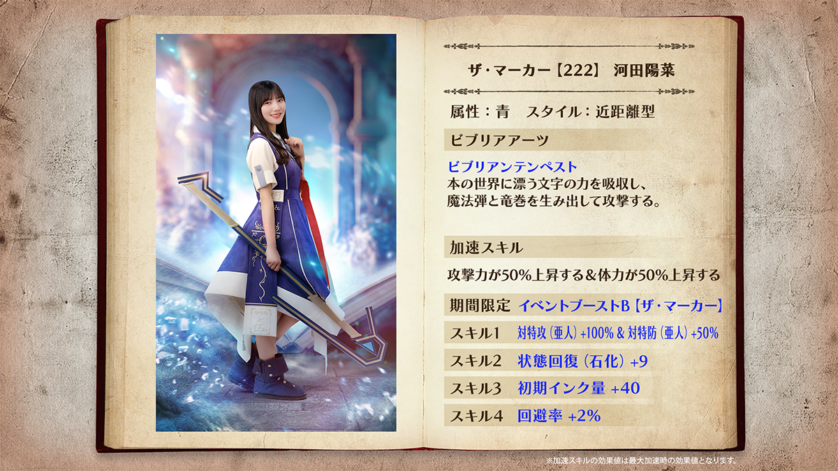 パーティ内の「★4 ザ・マーカー【222】 小坂菜緒」を超強化する効果持ち!イベントアイテム交換所から入手することができます。