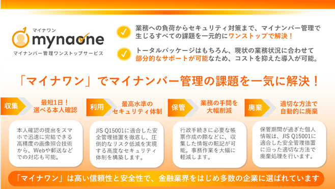このたび、当社およびODKが提供するマイナンバー管理のワンストップサービス「マイナワン」とTRUSTDOCKが協業することで、より多くの本人確認業務を必要とする事業者に利便性を提供できると考え、本提携にいたりました。マイナンバー管理ワンストップサービス「マイナワン」およびTRUSTDOCKは高い信頼性と安全性が要求される金融業界の水準に合わせてサービス設計されており、また導入企業のニーズによって柔軟にサービス提供範囲を選べるので、事業者様のニーズに合わせてご導入いただけます。
