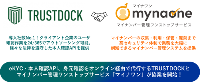 当社およびODKは、共同で提供するマイナンバー管理システムを、管理業務のさらなる効率化やユーザ利便性向上のため、2022年11月に「マイナワン」としてリニューアルし、煩雑なマイナンバー収集・管理の代行サービスを提供しております。一方、TRUSTDOCKは、eKYC、本人確認API、身元確認をオンライン経由で代行する専門会社であり、金融・証券をはじめ、保険、人材、リユース、不動産、シェアリングエコノミー、MVNO*3、自治体サービスなど、さまざまな業界の本人確認/KYCに対応し、導入社数実績No.1を誇ります。